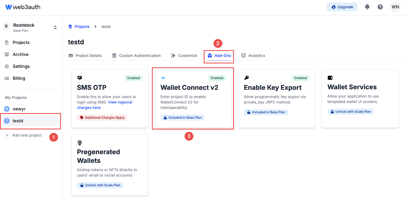 Dashboard > Project > Add-ons - Select WalletConnect v2 and input the WalletConnect Project ID.